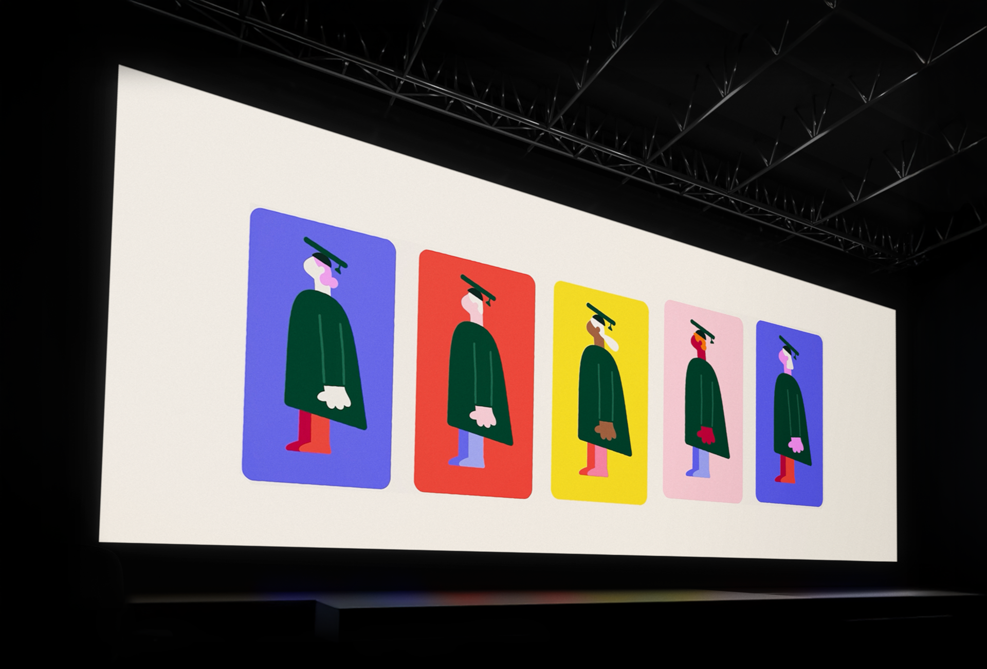 Our character design is intentionally simple and stylised, built from bold shapes and colours. All characters appear in graduation gowns and mortarboards, and their abstract look allows the animation to feel inclusive and reflective of the university’s wide and diverse student body.